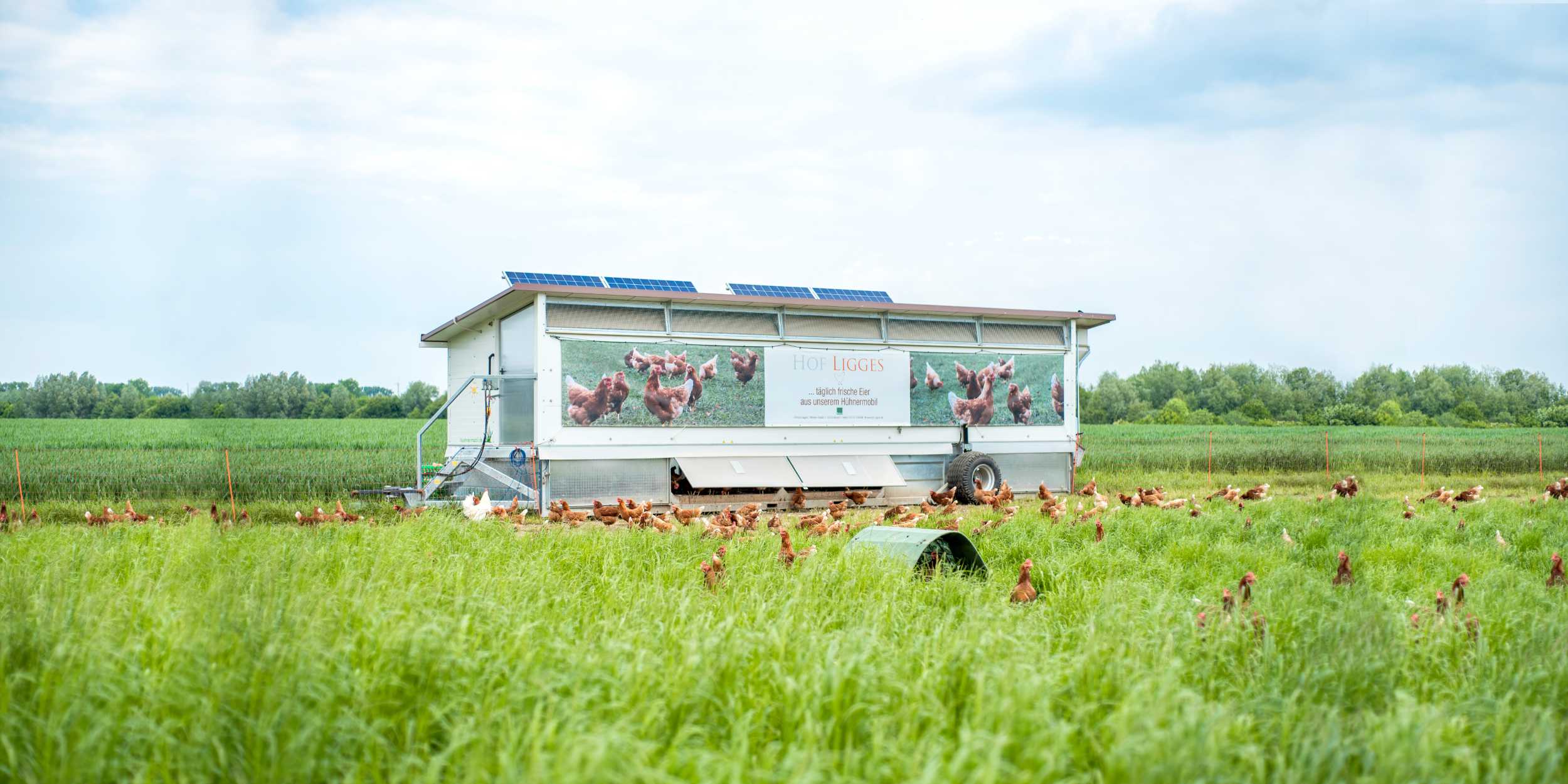 In unseren mobilen Ställen leben rund 300 Hühner mit Auslauf ins Grüne, die uns täglich frische Bio-Eier schenken.